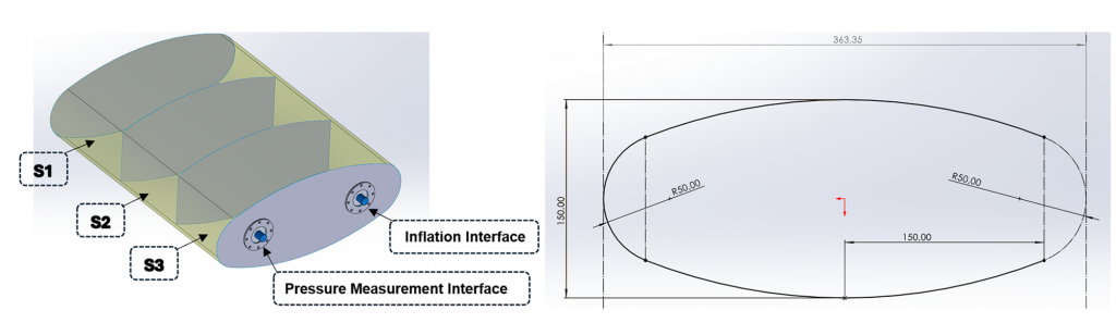 - A representative inflatable with all major Inflatable Structure features (Minimum radius: 50 mm, Volume: 19.5 l, Length: 450 mm);